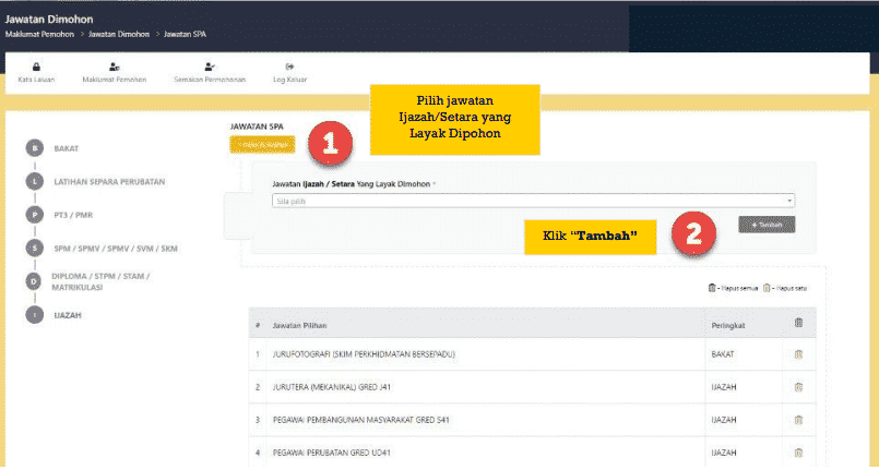 2. Pilih jawatan pada ruang Jawatan Yang Layak Dipohon dan tekan “+ Tambah” bagi memasukkan jawatan tersebut ke ruang Jawatan Yang Dipohon.